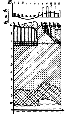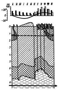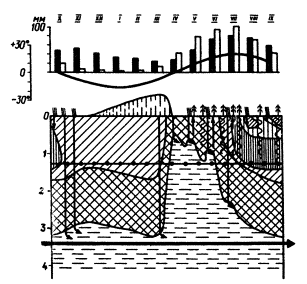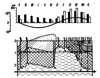 Рис. 4. Тип II. Группа Б. Периодически-промывные режимы. Подтип: Лесостепной (Условные обозначения даны на рис. 1) Из опубликованных в литературе методов расчета гидрологических показателей, зависящих от климатических условий, наиболее общим и теоретически обоснованным является метод гидролого-климатических расчетов В.С. Мезенцева [10], который был использован для разработки настоящих Методических указаний. Метод В.С. Мезенцева основан на уравнении водно-теплового баланса участка суши и позволяет рассчитывать относительную влажность деятельного слоя почво-грунта, суммарное испарение, сток и другие характеристики. Теоретическое обоснование метода дано в работе В.С. Мезенцева и И.В. Карнацевича [11]. Не считая возможным останавливаться здесь на теоретических положениях, развиваемых авторами, и экспериментальных данных, подтверждающих их выводы, приводим лишь ту часть расчетов, которая относится к оценке влажности грунтов в годовом цикле. В.С. Мезенцев выражает влажность почво-грунта в долях от величины наименьшей влагоемкости WHB и называет ее относительной влажностью V. Относительная влажность грунта на конец выбранного расчетного периода определяется по формуле (1). Расчет влажности состоит в решении системы уравнений (1), количество которых равно числу расчетных периодов за год, например 12, если расчетный период равен месяцу. Решение системы уравнений производится методом итерации при условии, что в среднем за многолетний период для срока в один год действительно отношение W1 = W2 = 0 (или V1 - VZ = 0). W1 и W2 - запасы влаги в деятельном слое почво-грунта соответственно на начало и конец годового периода. Исходными данными для расчета влажности грунтов являются средние месячные величины общего увлажнения КХ и максимально возможного испарения zm. Кроме того, в качестве исходных необходимо иметь денные о гидрологических характеристиках: наименьшей влагоемкости WHB и влажности разрыва капилляров WРК (для определения константы r), средних для расчетного почвенно-грунтового слоя. Определение величины наименьшей влагоемкости довольно сложно [4]. В полевых условиях WHВ определяют в окопанном со всех сторон на глубину более 1 м монолите, который сначала замачивают; затем в течение 10 суток ведут наблюдения над изменением влажности путем послойного (через 10 см) отбора образцов. По лабораторной методике отобранные послойно буром монолитики насыщают водой капиллярно снизу, затем устанавливают на сухой образец той же почвы и периодически определяют влажность. Оба способа довольно продолжительны и едва ли применимы при инженерно-геологических исследованиях. Поэтому для определения величины WHВ были использованы имеющиеся в литературе данные о связи WHВ c другими характеристиками грунта. Известно уравнение С.Н. Тюремнова [24]