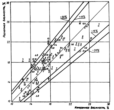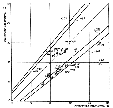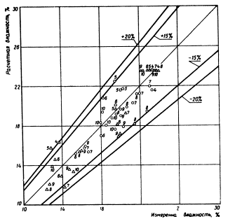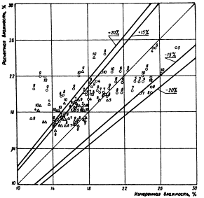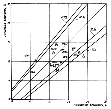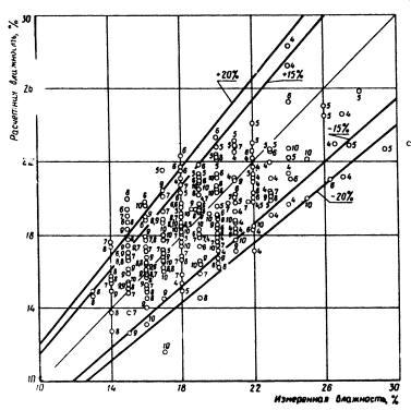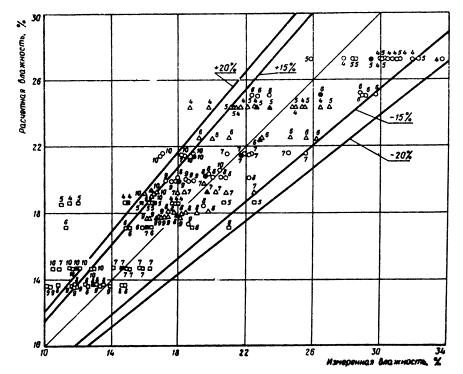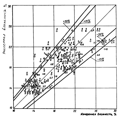 расчета по формуле (1) необходимо задаться величиной В результате расчета методом итерации системы уравнений (9) получают относительную влажность V для начала и конца каждого расчетного периода (месяца). Практически рассчитывают V только для весенних, летних и осенних месяцев (с апреля по октябрь). По величине V начала и конца месяца определяют среднемесячную относительную влажность Vcp. Далее по величине Vcp и наименьшей влагоемкости WHВ определяем влажность грунта W (см. формулу 9). По методу В.С. Мезенцева абсолютная влажность грунта не определяется, а величина Vсp используется для вычисления норм суммарного испарения, стока и других характеристик. 3. Проверка предложенного метода расчетаТребования к точности прогнозирования не могут быть столь же высоки, как к точности определения влажности грунтов непосредственно на месте изыскания. В почвоведении и грунтоведении принято считать нормальной относительную ошибку определения влажности почвы и грунта в 10% от измеряемой величины, что для связных грунтов соответствует в среднем величине ±2% абсолютной влажности. Как показывает А.А. Роде, указанную точность (10%) при заданной вероятности в 90% может обеспечить только трехкратная повторность определения влажности грунта. Учитывая существующую при инженерно-геологических изысканиях практику, согласно которой из данной точки опробования для характеристики грунта (в том числе для определения влажности) отбирается в большинстве случаев лишь один образец (в лучшем случае два), требуемая точность определения (10% от измеряемой величины) вряд ли достигается. Поэтому прогнозируемая влажность может отклониться от действительной величины более чем на 20%. Проверка метода В.С. Мезенцева проводилась на материалах агрометеорологических станций по данным, опубликованным в ряде монографий, а также по полевым наблюдениям, проведенным нами в 1971 г. Проверка состояла в том, что из приведенных источников были взяты результаты наблюдений за изменением влажности грунтов по глубине разрезов в течение ряда лет. По данным близлежащих метеостанций (сумма месячных осадков и дефицит влажности воздуха), а также физическим свойствам грунта (объемные и удельные веса, пористость) согласно методу В.С. Мезенцева были рассчитаны величины среднемесячных влажностей в исследованном слое грунта. Расчетные влажности были сопоставлены со средней для данного слоя среднемесячной влажностью по данным полевых наблюдений. Расчеты проводились сначала обычным путем, а затем была составлена программа для ЭВМ и дальнейшие расчеты выполнялись с помощью БЭСМ-4. Обработано было несколько тысяч данных и расчеты изложены более чем в сотне таблиц. Окончательные результаты выражены в виде графиков сравнения рассчитанных влажностей с измеренными. На графиках по оси абсцисс отложены измеренные влажности, на оси ординат - расчетные влажности. Прямая, проведенная из начала координат под углом в 45°, характеризует случаи совпадения расчетных влажностей с измеренными. Кроме того, на графиках нанесены линии, ограничивающие области отклонения расчетных влажностей от измеренных в пределах до 15 и до 20% (по отношению к измеренным величинам). Данные агрометеорологических станций содержали средние значения влажности метровой толщи почво-грунтов для каждого месяца с апреля по октябрь п