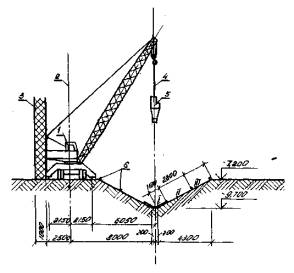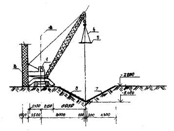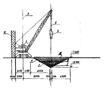 Рис. 5. Схема производства работ по установке арматуры днища и опорного кольца отстойника (разрез I-I): 1 - автомобильный края КC-3562А; 2 - ось движения крана; 3 - опасная зона хвостовой части крана; 4 - строп четырехветвевой; 5 - монтируемый арматурный каркас; 6 - установленная арматура; 7 - бетонная подготовка