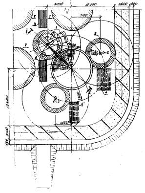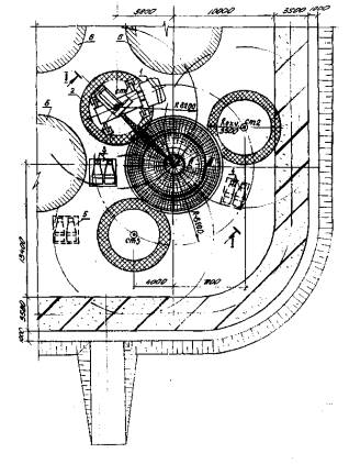 Рис 4. Схема производства работ по установке арматуры днища и опорного кольца отстойника: 1 - автомобильный кран КС-3562А; 2 - опасная зона хвостовой части крана; 3 - площадка складирования арматуры для стоянки 1; 4 - площадка складирования арматуры для стоянки 2; 5 - площадка складирования арматуры для стоянки 3; 6 - площадка складирования арматуры для стоянок 1 и 3; 7 - смонтированные отстойники