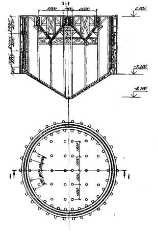 1. Область применения1.1. Технологическая карта разработана на устройство железобетонного монолитного отстойника диаметром 9 м по типовому проекту 902-2-72, разработанному Государственным проектным институтом Союзводоканалпроект. 1.2. В состав работ, рассматриваемых в карте, входят: устройство бетонной подготовки; устройство днища; устройство стен; устройство желобов, распределительного и сборного лотков; окраска горячей битумной мастикой за 2 раза; устройство прижимной кирпичной стенки. 1.3. Работы по возведению отстойника предусмотрено вести: бетонирование стен и балок - в 2 смени, остальные работы - в 1 смену. 1.4. При привязке технологической карты к конкретным объекту и условиям строительства уточняют объемы работ, калькуляцию трудовых затрат, средства механизации с учетом максимального использования наличного парка механизмов.