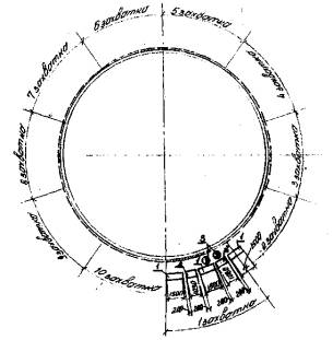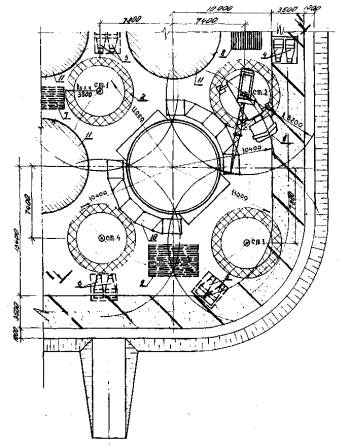 Рис. 9. Схема бетонирования стен: 1 - автомобильный кран КС-3562А; 2 - опасная зона хвостовой части крана; 3 - площадка для приема раствора со стоянки 1; 4 - площадка для приема раствора со стоянки 2; 5 - площадка для приема раствора со стоянки 3; 6 - площадка для приема раствора со стоянки 4; 7 - площадка для складирования арматуры со стоянки 1; 8 - площадка для складирования арматуры со стоянки 2; 9 - площадка для складирования арматуры со стоянок 3 и 4; 10 - трубчатые безболтовые леса; 11 - смонтированные отстойники Бетон на строительную площадку доставляют централизованно автобетоновозами или автосамосвалами, приспособленными для перевозки бетона. К месту укладки бетонную смесь подают в поворотных бадьях вместимостью 1 м3 автомобильным кран КС-3562А со стрелой длиной 14 м. Уплотняют ее виброрейкой СО-132 длиной 3 м. 2.3. При возведении отстойника применяется автомобильный кран КС-3562А. Бетонную подготовку выполняют полосами шириной 2,8 м по длине окружности. ширину полосы ограничивают маячными рейками, которые определяют проектную толщину и уклон подготовки. Для этого маячные рейки, выполняют в виде кружала. Полосы заполняются бетонной смесью через одну. Очередность заполнения полос и схема организации работ при бетонировании подготовки даны на рис. 2, 3. Работы по устройству бетонной подготовки выполняются в следующей последовательности: установка маячных реек; укладка бетонной смеси с разравниванием; уплотнение и выравнивание бетонной смеси виброрейкой; снятие маячных реек. Бетон, уложенный в жаркую солнечную погоду, следует немедленно накрыть, а во время дождя защитить от попадания воды. Случайно размытый слой бетона следует удалить. Устройство бетонной подготовки должно сопровождаться соответствующими записями в журнале бетонных работ. Устройство цементной стяжки выполняется полосами шириной 2,8 м по длине окружности. Ширину полосы ограничивают маячными рейками, которые определяют проектную толщину и уклон стяжки. Полосы заполняют цементным раствором состава 1:2 через одну (см. рис. 2, 3). Разравнивают цементный раствор деревянным правилом длиной 2,5 м. Работа по устройству цементной стяжки выполняются в следующей последовательности: установка маячных реек; укладка раствора с разравниванием; снятие маячных реек. Раствор, уложенный в стяжку в жаркую солнечную погоду, следует немедленно накрыть, а во время дождя защитить от попадания воды. Случайно размытый слой раствора следует удалить. По окончании устройства цементной стяжки составляется акт на скрытые работы. Устройство днища отстойника начинать с вязки нижних сеток и каркасов и укладки их на бетонных подкладках, обеспечивающих проектную толщину защитного слоя бетона. Верхние сетки фиксируют на каркасах-подставках. Организация работ при укладке арматуры приводится на рис. 4, 5. Установленную арматуру необходимо закрепить и предохранить от смещений и повреждений, которые могут произойти в процессе бетонирования. Принимать смонтированную арматуру и сварные стыковые соединения следует до укладки бетонной смеси и оформлять актом освидетельствования скрытых работ. К установке опалубки днища приступают после инструментальной проверки соответствия геометрических размеров щитов опалубки проектным. Устанавливают опалубку вручную, начиная с маячных щитов, которые ставят на расстоянии 3-4