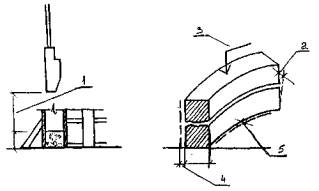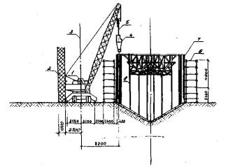 Рис. 10. Схема бетонирования стен (разрез I-I): 1 - автонобильный кран КС-3562А; 2 - опасная зона хвостовой части крана; 3 - ось движения крана; 4 - бадья для подачи бетона; ,5 - строп двухветвевой; 6 - трубчатые безболтовые леса; 7 - опалубка стен; 8 - опалубка балок Арматуру балок, подводящего и отводящего лотков устанавливают полностью на весь объем бетонных работ после проверки и приемки опалубки. Стены отстойника бетонируют с инвентарных трубчатых безболтовых лесов, установленных с наружной стороны отстойника (см. рис. 9) Бетон укладывают слоями толщиной 20-25 см в одном направлении по всему периметру стен с тем, чтобы до укладки последующего слоя прошло не более 2 ч. Балки приемного и отводящего лотков должны бетонироваться непрерывно. При перерывах в бетонировании более двух часов работы возобновляют лишь после достижения ранее уложенным бетоном прочности 15 кг/см2. Поверхность рабочего шва очищают от цементной пленки и смачивают водой. Оставшуюся на поверхности воду удаляют. Бетонную смесь уплотняют глубинным вибратором. Оптимальная продолжительность вибрирования на одном месте должна быть 20-30 с. Во время уплотнения бетонной смеси глубинным вибратором опирание его на арматуру и закладные части не допускается. Бетонирование должно сопровождаться соответствующими записями в журнале бетонных работ. При уходе за бетоном необходимо: обеспечивать благоприятные температурно-влажностные условия для твердения бетона, предохранять его от вредного воздействия ветра, прямых солнечных лучей, систематически поливая водой влагоемкие покрытия (мешковину, слой песка, опилок) открытых поверхностей бетона; в сухую погоду открытые поверхности бетона поддерживать во влажном состоянии до достижения бетоном 70% проектной прочности. При выполнении торкретных работ используют установленные внутри отстойника для поддержки опалубки стен и балки леса, на прогоны которых укладывают настил, и столики-козелки для малярных и штукатурных работ. Торкретирование поверхностей отстойника производят ярусами (рис. 11).