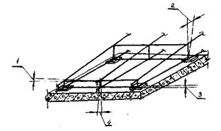 Рис. 13. Допустимые отклонения геометрических размеров при установке арматуры днища отстойника: 1 - в расстояниях между связями арматурных каркасов ± 10 мм; 2 - в положении стержней в торцах сварных каркасов ± 5 мм; 3 - в отдельных местах в толщине защитного слоя ± 10 мм; 4 - в расстояниях между отдельно установленными рабочими стержнями ± 10 т