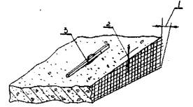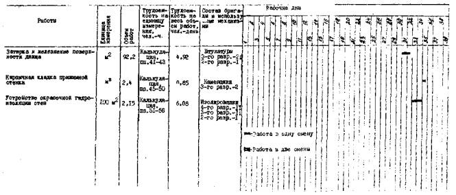 Рис. 12. Схема разбивки на захватки и организация рабочего места на захватке при кладке прижимной стенки: 1 - пакет красного кирпича; 2 - ящик с раствором; 3 - каменщики Запас кирпича принимают из расчета двухчасовой потребности, растворные ящики заполняют раствором за 10-15 мин до начала кладки. В процессе работы запас материалов пополняют. Кирпичную кладку ведут операционно-расчлененным методом, при котором каждый рабочий ежедневно выполняет одни и те же операции. 2.4. При производстве бетонных работ в зимнее время должны выдерживаться требования СНиП III-15-76 "Правила производства и приемки работ. Бетонные и железобетонные конструкции монолитные". Руководства по производству бетонных работ и других инструктивных документов по зимнему бетонированию. Опалубку и арматуру перед бетонированием очистить от наледи и снега. Для антиадгезионного покрытия рабочей поверхности опалубки применяют гидрофобизирующие смазки на основе продуктов нефтехимии, не загустевающие на морозе, - солидольную или петролатумно-керосиновую. Особенностью производства бетонных работ при отрицательных температурах воздуха является необходимость выполнения мероприятий, обеспечивающих минимальные потери тепла бетонной смесью от момента ее приготовления до укладки в опалубку конструкции. Торкретирование поверхности отстойника выполняют при температуре воздуха не ниже + 5°С. Если температура ниже этого предела, работы прекращают и срочно принимают меры к предохранению торкрет-штукатурки от замораживания: утепляют нанесенные слои и устраивают тепляки около оборудования. При отрицательной температуре испытывать и заполнять отстойник нельзя. Кирпичную прижимную стенку в зимних условиях выполняют способом замораживания или применяя обычные растворы с химическими противоморозными добавками. При отрицательной температуре наружного воздуха для выполнения обмазочной и оклеечной гидроизоляции используются только холодные мастики. 2.5. Устройством днища, стен и покрытия занимается бригада из десяти человек: плотники-бетонщики 4-го разряда - 3; плотники-бетонщики 2-го разряда - 4; арматурщик-сварщик 6-го разряда - 1; арматурщики-сварщики 3-го разряда - 2; нанесением торкрет-штукатурки бригада из шести человек: штукатуры 4-го разряда - 2; штукатуры 3-го разряда - 3; машинист цемент-пушки 2-го разряда - 1; машинист компрессора 3-го разряда - 1; испытанием резервуара - звено: слесари-сантехники 5-го разряда - 3; рабочие 2-го разряда - 3; компрессорщик 3-го разряда - 1; устройством и разборкой лесов - звено монтажников: монтажник 4-го разряда - 1; монтажника 3-го разряда - 2; монтаиник 2-го разряда - 1; устройством гидроизоляпии - звено гидроизолировщиков: изолировщик 4-го разряда - 1; изолировщик 3-го разряда - 1; изолировщики 2-го разряда - 2; машинист 3-го разряда - 1; На подаче материалов работают машинист 5-го разряда и такелажник 2-го разряда. 2.6. График, выполнения работ приведен в таблице 1. 2.7. Калькуляция трудовых затрат приведена в таблице 2. 2.8. Рациональная организация, методы и приемы труда при выполнении рабочих процессов и операций приняты в соответствии с типовыми картами трудовых процессов КТ-4.1-33.20-76, КТ-4.1-37.31-76, КТ-4.1-27.26-76, разработанными конструкторско-технологическим институтом Минпромотроя СССР; KT-3.1-1.8-76, KT-1.0-6.1-76, разработанными трестом Мособлоргтехстрой и ЦНИБ Главмособлстроя при М