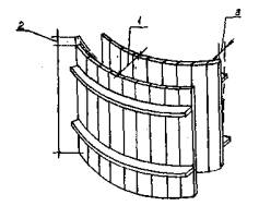Рис. 15. Допустимые отклонения геометрических размеров, при установке опалубки стен отстойника: 1 - во внутренних размерах поперечных коробов опалубки и в расстояниях между внутренними поверхностями опалубки стен от проектных размеров 15 мм; 2 - от проектных размеров но длине и ширине щитов +5 мм; 3 - от вертикали или от проектного наклона плоскостей опалубки и линии их пересечения на 1 м высоты 5 мм; на всю конструкцию стен при высоте более 5 м - 15 мм; разница в толщине сменных досок щитов нестроганой опалубки ± 2 мм, строганой ± 0,5 мм