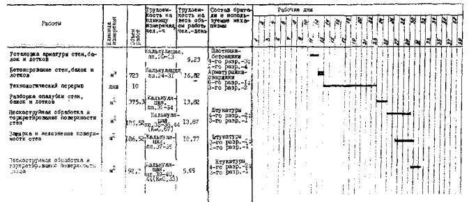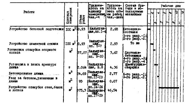 Проектной разработки вопросов, связанных с обеспечением безопасности бетонных, изоляционных работ и работ по устройству кирпичной прижимной стенки, не требуется. При торкретировании поверхности необходимо: перед началом каждой смены проверять исправность торкрет-машины, шлангов, дозаторов и другого оборудования (предохранительные клапаны и манометры должны быть опломбированы); запрещать работу на цемент-пушке под давлением, превышающим указанное в технических паспортах; разборку, ремонт и очистку торкрет-машины выполнять после снятия давления и отключения машины от электросети; рабочие места сопловщиков связать сигнализацией (звуковой, световой) с рабочим местом моториста торкрет-машины; при работе на открытом воздухе сопловщику обязательно надевать очки. В закрытых помещениях очки и респираторы надевать всем членам бригады; после окончания работы цемент-пушку очистить от невыработанных материалов, все шланги продуть сжатым воздухом и скрутить в бухты. 3. Технико-экономические показателиЗатраты труда на весь объем работ, чел.-день . . . . . . . . . . . . . . 142,86 Затраты труда на 1 м3 объема отстойника, чел.-день . . . . . . . . . 0,26 Выработка на одного рабочего в смену, м3 объема отстойника 3,83 Стоимость затрат труда, руб.-коп . . . . . . . . . . . . . . . . . . . . . . . . . 824-12 Средняя заработная плата на 1 чел.-день, руб.-коп . . . . . . . . . . 5-77 Затраты машино-смен на весь объем работ . . . . . . . . . . . . . . . . . 22 В том числе: Для установки "Пневмобетон" . . . . . . . . . . . . . . . . . . . . . . . . . . . 6 для автомобильного крана КС-3562А . . . . . . . . . . . . . . . . . . . . . 16 4. Материально-технические ресурсы4.1. Потребность в основных материалах и полуфабрикатах Таблица 4