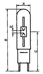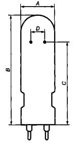 А - диаметр колбы; В - расстояние от базовой плоскости до купола колбы; С - высота светового центра; D - длина дуги Рисунок 2 - Лампа с цоколем G8.5 Базовая плоскость определяется концами штырьков. Дуга расположена по оси лампы. 1.4.3.2 Основные размеры ламп с цоколями RX7s, RX7s-24 и Fc2 должны соответствовать значениям, указанным в таблице 2. Таблица 2
