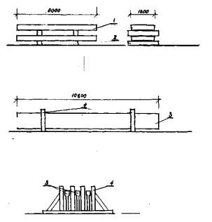 Рис. 2. Схема складирования конструкций; 1 - стеновые панели; 2 - подкладки; 3 - балки; 4 - кассета для складирования балок