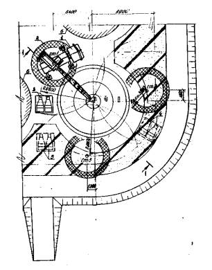 Рис. 7. Схема бетонирования днища; 1 - автомобильный кран КС 3562А; 2 - опасная зона хвостовой части крана; 3 - площадка для приема бетона со стоянки 1; 4 - площадка для приема бетона со стоянки 2; 5 - площадка для приема бетона со стоянки 3; 6 - смонтированные отстойники; I, II, III - очередность заполнения полос.