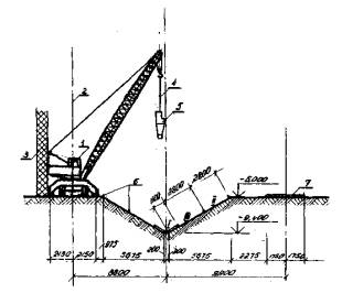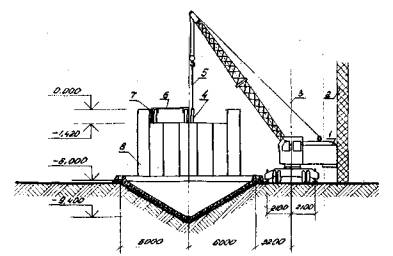 Рис. 14. Схема монтажа балок: 1 - монтажный кран; 2 - опасная зона хвостовой части крана; 3 - смонтированные стеновые панели; 4 - балки; 5 - монтажный проем; 6 - складирование балок для стоянки 2; 7 - складирование балок для стоянки 1; 8 - смонтированные отстойники
