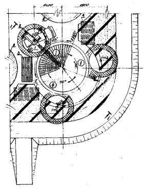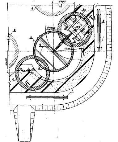 Рис. 15. Схема монтажа балок (разрез I-I): 1 - монтажный кран; 2 - опасная зона хвостовой части крана; 3 - ось движения крана; 4 - монтируемая балка; 5 - приспособление для монтажа балок; 6 - распорка для временного крепления балок; 7 - крепление балки арматурой монолитного участка; 8 - стеновые панели К бетонированию монолитных участков 1 и 2 приступают после монтажа сборных железобетонных балок. Бетон на строительную площадку доставляется автобетоновозами или автосамосвалами. Арматурные сетки на строительную площадку доставляются автотранспортом, а к месту установки - автомобильным креном КС-3562А, с пятнадцатиметровой стрелой. Работы по устройству монолитных участков выполняются в следующей последовательности: установить опалубку с внутренней стороны монолитного участка; установить арматурные сетки монолитного участка; бетонировать с помощью установки "Пневмобетон" с приставкой инженера Н. Марчукова слоями толщиной 20-50 мм; снять опалубку после достижения бетоном прочности, обеспечивающей сохранность поверхности и кромок углов при снятии опалубки. При выполнении, торкретных работ используют универсальную сборно-разборную вышку-подмости. С поверхности, подлежащей торкретированию, удаляют неровности, обрабатывают ее пескоструйным способом и промывают струей воды при помощи установки CB-13. Пескоструйную обработку производят песчано-воздушной струей, используя просушенный чистый песок крупностью до 8 мм, который завозят на площадку централизованно автосамосвалами и загружают в цемент-пушку скиповым загрузочным ковшом растворосмесителя. Смесь для торкретирования приготовляют на сульфатостойком портландцементе марки 400 (ГОСТ 10173-76) в растворосмесителе СБ-97 (СБ-30). Заполнитель - среднезернистый песок с крупностью частиц не более 5 мм (ГОСТ 8736-77). С целью повышения водонепроницаемости необходимого торкретного слоя рекомендуется следующие составы сухой смеси для: днища резервуара - 1:1,375; стен - 4,5. Цемент и песок дозируют только по массе с учетом влажности песка (4-5%). Торкрет-штукатурку наносят при помощи установки, состоящее из цемент-пушки СБ-13, компрессоре ДК-9, бака для воды, воздухоочистителя и сопла с насадками и шлангов, в соответствии со СНиП III-15-80 "Правила производства и приемки работ. Бетонные и железобетонные конструкции монолитные". Торкрет-штукатурку на внутренние поверхности отстойника наносят в три слоя: два толщиной 10 мм с последующей затиркой, третий толщиной 5 мм с затиркой и железнением. Каждый последующий слой наносят после схватывания раствора предыдущего. Перерывы свыше 10 мин во время торкретирования отдельных ярусов не допускаются. Торкрет-штукатурку на портландцементе увлажняют через 12-16 ч. В дальнейшем обработанную поверхность увлажняют через каждые 3 ч распыленной струей воды. При торкретировании сопло должно находиться на расстоянии 80-100 см от покрываемой поверхности. Его ствол перемещают по спирали и держат строго перпендикулярно торкретируемой поверхности. После нанесения последнего слоя торкрет-штукатурки и его затирки спустя 1-2 ч поверхность железнят при помощи гладилки. До начала испытания отстойника должны быть выполнены следующие работы: закончены все строителько-монтажные работы по сооружению отстойника; визуально осмотрены все конструкции снаружи и внутри резервуара, а также технологическ
