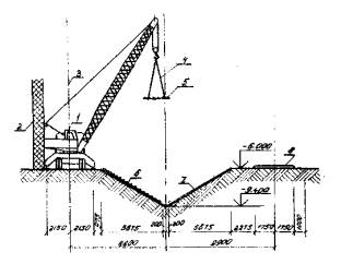 Рис. 10. Схема монтажа стеновых панелей (разрез I-I): 1 - стеновые панели; 2 - вилочный захват; 3 - двухветвевой строп; 4 - монтажный кран; 5 - опасная зона хвостовой части крана; 6 - ось движения крана
