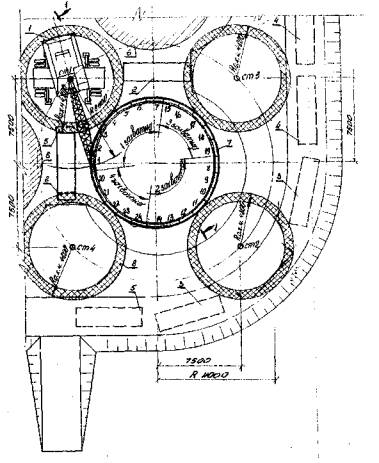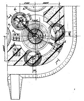 1.4. При привязке технологической карты к конкретным объекту и условиям строительства принятый в карте порядок выполнения работ по устройству отстойников, размещение механизмов, объемы работ, калькуляцию трудовых затрат и средства механизации уточняют в соответствии с принятыми решениями. 2. Организация и технология строительного процесса2.1. До начала устройства отстойников должны быть выполнены следующие работы: ограждена строительная площадка; отрыт котлован; организован отвод грунтовых и поверхностных вод; устроены временные автодороги, предусмотренные ситуационным планом (рис. 1); подведена электроэнергия и устроено освещение строительной площадки и мест производства работ; доставлены на объект автомобильный кран, сварочные трансформаторы, инвентарь, инструмент и приспособления; выполнена ручная подчистка основания под отстойники непосредственно перед бетонированием подготовки. 2.2. Бетон на строительную площадку доставляют централизованно, автобетоновозами или автосамосвалами, приспособленными для перевозки бетона. Арматурные сетки, каркасы, стеновые панели и другие материалы, необходимые для устройства отстойников, доставляют на объект грузовыми автомашинами в зону действия монтажного крана с созданием не менее чем четырехсменного запаса, который должен постоянно поддерживаться. Схемы складирования материалов показаны на рис. 2. 2.3. Бетонную подготовку выполняют горизонтальными полосами шириной 2,8 м по длине окружности. Ширину полосы ограничивают маячными рейками, которые определяют проектные толщину и уклон подготовки. Для этого маячные рейки выполняют в виде кружала. Полосы заполняют бетонной смесью через одну. Очередность заполнения полос и схема организации работ при бетонировании подготовки даны на рис. 3, 4.