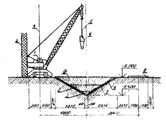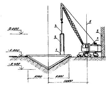 Рис. 8. Схема бетонирования днища (разрез I-I): 1 - автомобильный кран КС-3562А; 2 - опасная зона хвостовой части крана; 3 - ось движения крана; 4 - бадья для подачи бетона; 5 - строп двухветвевой; 6 - уложенная арматура днища; 7 - бетонная подготовка; 8 - временная автодорога; I, II III - очередность заполнения полос По достижении бетоном, уложенным в днище, достаточной прочности (не менее 15 кг/м2) необходимо установить опалубку опорного кольца и приступить к укладке в нее бетона. Для передвижения рабочих, занятых установкой маячных реек и бетонированием днища, прокладываются ходовые деревянные трапы шириной 0,6 м. Бетонная смесь, уложенная в днище отстойника, уплотняется виброрейкой CО-132 длиной 3 м, а в опорном кольце-глубинным вибратором ИВ-47 с рабочей частью длиной 440 мм. Продолжительность вибрирования 20-30 с. Уплотнение бетонной смеси прекращают, когда она перестает оседать; крупный заполнитель покрывается раствором, на поверхности и в местах соприкосновения с опалубкой появляется цементное молоко, перестают выделяться воздушные пузырьки. После окончания бетонирования и при перерывах в работе более одного часа следует очистить от остатков бетонной смеси вибраторы и мелкий инструмент. При перерывах в бетонировании более двух часов подготовленные к укладке бетонной смеси поверхности затвердевших рабочих швов рекомендуется покрывать непосредственно перед бетонированием цементным раствором толщиной 20-50 мм или слоем пластичной бетонной cмеси. Бетонирование должно сопровождаться соответствующими записями в журнале бетонных работ. При уходе за бетоном необходимо обеспечивать благоприятные температурно-влажностные условия для твердения бетона, предохранять его от вредного воздействия ветра, прямых солнечных лучей, систематически поливая водой влагоемкие покрытия (мешковину, слой песка, опилок и т.д.) открытых поверхностей бетона; (частота полива зависит от климатических условий и необходимости поддержания поверхности бетона во влажном состоянии). В сухую погоду открытые поверхности бетона должны поддерживаться во влажном состоянии до достижения бетоном 70% проектной прочности. До начала монтажа стеновых панелей отстойника должны быть выполнены следующие работы: окончено бетонирование днища и опорного кольца; принято опорное кольцо, то есть проведена геодезическая проверка соответствия его планового и высотного положения проектному, и составлена исполнительная схема; при необходимости опорная поверхность для стеновых панелей выровнена цементным раствором; размечены стоянки монтажного крана; завезены стеновые панели и разложены по маркам в порядке очередности монтажа. К монтажу стеновых панелей приступают только после достижения бетоном опорного кольца 70% проектной прочности. Стеновые панели завозятся на объект автотранспортом и складируются в зоне действия крана с укладкой на деревянные подкладки (рис. 9). Они монтируются краном КС-5363 с пятнадцатиметровой стрелой при помощи траверсы. Схема строповки стеновой панели дана на рис. 11.