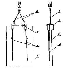 Рис. 11. Схема строповки стеновой панели: 1 - стеновая панель; 2 - двухветвевой строп; 3 - траверса; 4 - цепной строп с замком Смаля