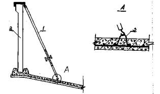 Рис. 12. Схема временного крепления стеновых панелей: 1 - подкос со струбциной; 2 - стеновая панель; 3 - петля Ø 10A1 Стыки стеновых панелей свариваются после очистки торцовых поверхностей. Электросварку должен выполнять дипломированный сварщик под руководством инженерно-технического работника, прошедшего специальную подготовку и аттестацию. Места сварки перед наложением шва очищаются от ржавчины, окалины и грязи. Выполненные сварочные швы должны иметь мелкочешуйчатую поверхность без наплывов, перерывов и плавный переход к основному металлу. Замоноличивание горизонтальных стыков производится после выверки правильности установки конструкций и приемки сварных соединений. Стыки заделываются бетоном марки 300 на мелком заполнителе с тщательным уплотнением ножевым вибратором. Замоноличивание вертикальных стыков стеновых панелей производится по окончании сварки и антикоррозионной защиты закладных деталей механизированным способом при помощи остановки "Пневмобетон" с приставкой инженера А. Марчукова через инъекционное отверстие, расположенное в нижней зоне стыка, методом восходящего потока, что обеспечивает высокую плотность шпонки по всей высоте (рис. 13).