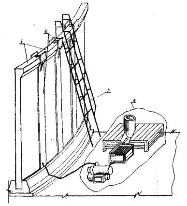Рис. 13. Схема заполнения стыков механизированным способом: 1 - стеновые панели; 2 - инвентарная опалубка; 3 - лестница МС-56-7-00; 4 - установка "Пневмобетон" с приставкой инженера Н. Марчукова Применяемый для замоноличивания стыков раствор должен отвечать требованиям СН 290-74 "Инструкция по приготовлению и применению строительных растворов", а также обладеть следующими свойствами: вязкостью; минимальным водоотделением; прочностью в двадцативосьмидневном возрасте, определяемой по контрольным кубикам размером 40×40×160 мм, которая должна быть не менее 400 кгс/см2; морозостойкостью; подвижностью раствора, определяемой погружением стандартного конуса СтройЦНИЛа, в пределах 8-9 см. Вязкость раствора должна быть такой, чтобы он свободно передвигался по каналу. Оптимальную вязкость раствор приобретает при водоцементном отношении, равном 0,35-0,45, и нормальной густоте цементного теста - в пределах 22-28%. Инъекционный раствор должен быть морозостойким. Испытывать на морозостойкость надо лабораторным путем на образцах, представляющих собой призму сечением 4×4 см и длиной 16 см и снабженных по торцам металлическими штифтами. Испытанию подвергаются три образца. Рекомендуется состав инъекционного цементно-песчаного раствора (цемент, песок, вода) 1 : 0,25 : 0,45 (по массе). Раствор приготовляется централизованно или на объекте. Перед замоноличиванием стыков раствор предварительно активизируется в смесителе С-863 в течение 1,5 мин. Стыки перед замоноличиванием раствором тщательно промываются водой при помощи растворонасоса. Бункер растворонасоса загружают активизированным раствором через вибросито, после чего включают насос, сливают отстоявшуюся в насосе и шланге воду. При появлении густого раствора сопло устанавливают в отверстие опалубки стыка, которое устраивается на высоте 250 мм от низа стеновой панели. Во время замоноличивания стыка прекращать работу растворонасоса не следует. При перерыве в работе более 10 мин. необходимо устройство нового инъекционного отверстия. Замоноличивание стыка прекращается при появлении над верхней кромкой стеновой панели раствора. После извлечения сопла отверстие в опалубке заделывается пробкой. По завершении инъецирования стыков установку следует промыть водой. Через 1,5 ч после заполнения стыка стяжные болты опалубки необходимо провернуть, чтобы нарушить сцепление с бетоном, а через 3 ч их можно извлечь и снять опалубку. Образовавшиеся от болтов отверстия зачеканиваются на всю глубину раствором на расширяющемся портландцементе сразу после снятия опалубки. В качестве опалубки применяются инвентарные щиты шириной 930-300, высотой 4600 и 6000 мм с уплотнением по всему внутреннему контуру щита пористой резиной толщиной не менее 30 мм с закрытыми порами. Опалубку крепят к стеновым панелям болтами, пропускаемыми через отверстия в стыке, диаметр которых не менее 20 мм. Болты M14 длиной 500 мм устанавливают друг от друга на расстоянии 800 мм. К монтажу сборных железобетонных балок следует приступать только после достижения бетоном в стыках 70% проектной прочности. Балки завозят на объект автотранспортом и складируют в зоне действия крана в кассеты. Последовательность выполнения работ при монтаже балок отстойников следующая: очистить балки, а также места установки их от грязи, мусора, снега, наледи, а закладные детали - от наплывов б