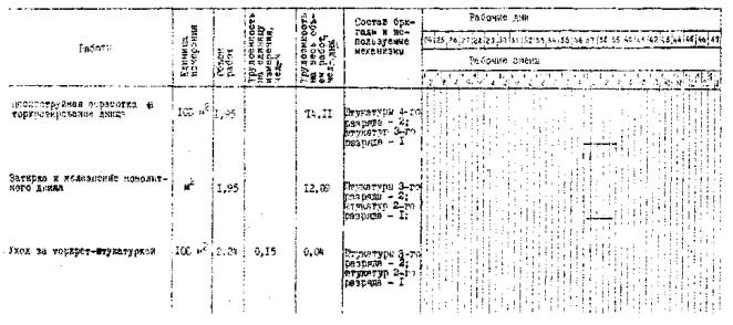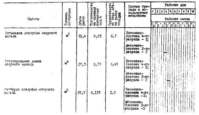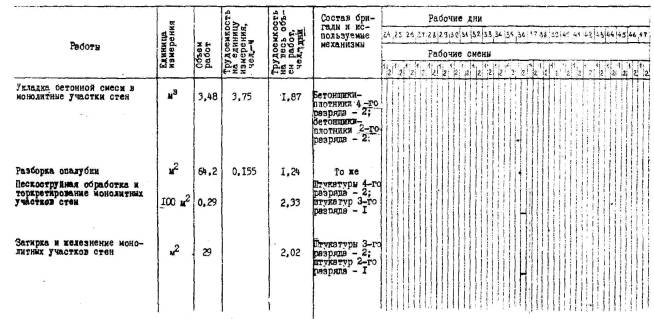 2.10. При производстве работ необходимо соблюдать правила по технике безопасности, приведенные в СНиП III-4-80 "Правила производства и приемки работ. Техника безопасности в строительстве". Проектной разработки вопросов, связанных с обеспечением безопасности бетонных, монтажных, изоляционных работ, не требуетcя. При производстве работ по торкретированию поверхности необходимо соблюдать следующие условия: перед началом каждой смены следует проверить исправность торкрет-машины, шлангов, дозаторов и другого оборудования. Предохранительные клапаны и манометры должны быть опломбированы; запрещается работать цемент-пушке под давлением, превышающим указанное в технических паспортах; разборку, ремонт и очистку торкрет-машины выполнять после снятия давления и отключения машины от электросети; рабочие места сопловщиков должны быть связаны сигнализацией (звуковой, световой) с рабочим местом моториста торкрет-машины; на открытом воздухе сопловщик должен обязательно работать в очках. В закрытых помещениях все члены бригады должны работать в очках и респираторах; после окончания работы цемент-пушка должна быть очищена, все шланги продуты сжатым воздухом и скручены в бухты. 3. Технико-экономические показателиЗатраты труда на весь объем работ, чел.-дни 111,99 Затраты труда на 1 м3 объема отстойника, чел.-дни 0,13 Выработка на одного рабочего в смену, м3 объема отстойника 7,6 Стоимость затрат труда, руб.-коп 652-22 Средняя заработная плата на 1 чел.-день, руб.-коп 5-82 Затраты машино-смен на весь объем работ 8 В том числе для кренов: КС-3562А 5,5 КС-5363 2,5 4. Материально-технические ресурсы4.1. Потребность в основных материалах и полуфабрикатах Таблица 4