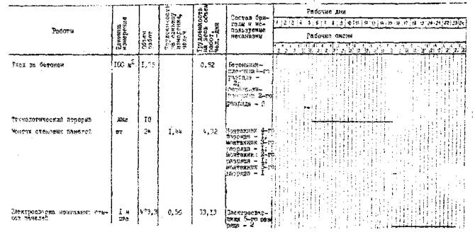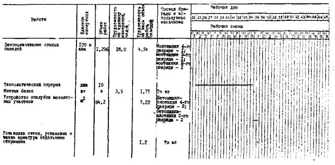 2.8. Устройство бетонной подготовки выполняет звено бетонщиков-плотников. Бетонщик-плотник 1 устанавливает маячные рейки, определяющие проектную толщину подготовки. Бетонщик-плотник 2 принимает бетонную смесь, очищает лопатой кузов автосамосвала, укладывает бетон с частичной перекидкой. Бетонщик-плотник 1 разравнивает и уплотняет бетонную смесь виброрейкой. Бетонщик-плотник 2 снимает маячные рейки после твердения бетона. Оставшиеся смежные полосы заполняются аналогично. Установку арматурных сеток выполняет звено арматурщиков. Арматурщик 2 подготавливает арматурные сетки к установке, очищает их от пыли, грязи, ржавчины. Арматурщик 3 стропит пакеты и при помощи автомобильного крана КС-3562А с пятнадцатиметровой стрелой подает их к месту укладки. Арматурщик 4 подносит, укладывает и выверяет подкладки и совместно с арматурщиком 1 укладывает сетки. Арматурщик 1 выверяет установку сеток. Электросварщик 1 сваривает стыки арматурных сеток. Бетонирование днища выполняет звено бетонщиков-плотников. Бетонщик-плотник 1 проверяет правильность укладки арматуры и установки прокладок, обеспечивающих толщину защитного слоя бетона; совместно с бетонщиком-плотником 2 устанавливает маячные направляющие рейки; принимает бетонную смесь из кузова автомобиля-самосвала в бункер; очищает лопатой кузов от остатков бетонной смеси. Бетонщик-плотник 1 принимает и укладывает поданную в бункерах краном КС-3562А бетонную смесь непосредственно на место укладки, уплотняет ее совместно с бетонщиком 2 виброрейкой. Бетонщик-плотник 2 укладывает бетонную смесь в опалубку "зуба". Бетонщик-плотник 1 уплотняет бетонную смесь глубинным вибратором. Монтаж стеновых панелей выполняет звено монтажников. Монтажник 4 производит внешний осмотр панели, закладных частей, подготавливает ее к строповке, стропует за монтажные петли, подает команду машинисту крана о подъеме панели и доставке ее к месту установки. Монтажник 3 подготавливает растворную постель на месте установки панели. Машинист крана 1 плавно поднимает панель, переводит ее из горизонтального положения в вертикальное и перемещает к месту установки. Панель заводят к месту установки с внешней стороны сооружения так, чтобы стрела крана не проходила над рабочими местами монтажников. При установке стеновой панели машинист крана по команде монтажника 2 приостанавливает опускание панели на высоте около 50 см от опорной поверхности. Монтажники 2 и 3, стоя у торцов стеновой панели, принимают ее и подводят к месту установки, ориентируясь по рискам. Монтажник 2 подает команду машинисту крана опустить панель, после чего монтажник 3 с монтажной площадки временно крепит панель струбциной и подкосом. Проверив правильность и надежность крепления панели, монтажник 2 дает команду машинисту крана ослабить стропы и рейкой-отвесом проверяет правильность положения панели по вертикали. В случае отклонения от проектного положения монтажник 4 приводит ее в вертикальное положение вращением фapкопфа. Монтажник 2 освобождает стеновую панель от стропа и дает команду машинисту крана отвести крюк крана в сторону. Монтажник 3 подготавливает место для установки следующей стеновой панели, устраивает растворную постель. Бетонщики 1, 3 устанавливают опалубку и закрепляют ее в проектном положении 1. После установки опалубки бетонщик 3 п