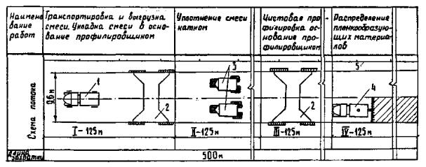 машинист профилировщика 6 разр., помощник машиниста 5 разр., дорожные рабочие 4 и 2 разр. распределяют смесь, планируют ее под укатку, производят чистовую планировку основания. В начале работы машинист профилировщика и его помощник готовят машину к работе, а дорожные рабочие 4 и 2 разр. устанавливают ограждения участка работ и сигнальные знаки, а также выполняют другие вспомогательные работы под руководством мастера.