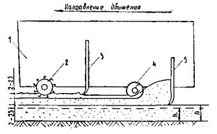 Рабочие органы профилировщика устанавливают следующим образом (рис. 2): отвал шнека - на высоту верха основания плюс припуск на уплотнение 2-2,5 см и на срезку при чистовой планировке 0,5-1 см при уплотнении катками; отвал фрезы выше отвала шнека на 10-15 см; фреза и шнек - на 1 - 2 см выше отвала шнека; боковые крышки шнека открыты, а открылки разведены на ширину 0,75 м каждая; вибробрус - на высоту основания плюс припуск на срезку при чистовой планировке 0,5-1 см (если требуется дополнительное уплотнение катком). Ширину вибробруса увеличивают до 9,6 м за счет надставок.