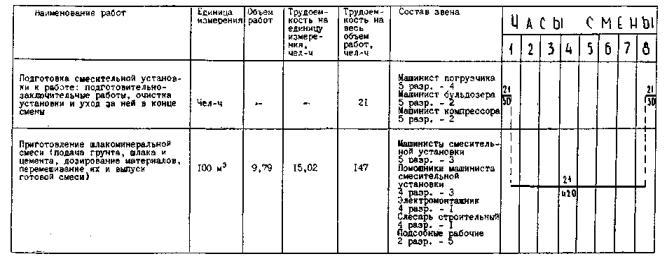 Для создания необходимого задела к началу смены смесительные установки начинают работу по приготовлению смеси на 1,5-2 ч раньше начала смены.