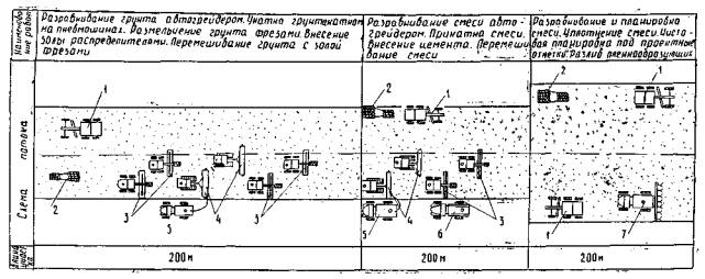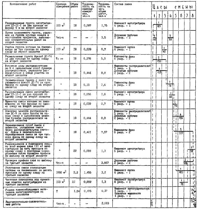 СТРОИТЕЛЬСТВА ТЕХНОЛОГИЧЕСКИЕ КАРТЫ УСТРОЙСТВО КОНСТРУКТИВНЫХ СЛОЕВ МОСКВА 1984 Типовые технологические карты разработаны отделом проектирования и внедрения передовой технологии строительства автомобильных дорог и аэродромов согласно плану института на 1983 г. и предназначены для применения при разработке проекта производства работ, для организации труда на объектах строительства. При разработке технологических карт использовались материалы Союздорнии. Технологические карты рекомендованы для применения техническим советом ВПТИтрансстроя 28 сентября, протокол № 4. Ответственные исполнители Н.И. Осипова, Е.Ю. Яркина. Содержание ВВЕДЕНИЕТехнологические карты разработаны на основе применения принципов научной организации труда и предназначены для использования при составлении проектов производства работ и при организации труда на объекте строительства. Карта № 1. «Устройство оснований при отрицательных температурах из грунтов, укрепленных шлаковыми вяжущими (феррошлаки, бокситовый шлак), приготовленных в смесительной установке». Карта № 2. «Устройство теплоизолирующего слоя из местного грунта, укрепленного золой уноса сухого отбора, смешиванием на месте». Карта № 3. «Устройство оснований из отходов горнорудной промышленности и золошлаковых отходов ТЭЦ, укрепленных портландцементом». В технологических картах № 1, 3 предусмотрен сменный темп укладки основания 500 м. Шлакоминеральное основание толщиной 18 см и основание из отходов горнорудной промышленности и золошлаковых отходов ТЭЦ толщиной 17 см укладывают на земляное полотно профилировщиком ДС-97. Ширина основания-9,6 м. Шлакоминеральную смесь из отходов горнорудной промышленности, золошлаковых отходов ТЭЦ и цемента приготавливают в смесительных установках ДС-50А, оборудованных для дозирования многокомпонентного вяжущего, и доставляют к месту укладки в автомобилях-самосвалах. В технологической карте № 2 предусмотрен сменный темп укладки 200 м. При устройстве теплоизолирующего слоя толщиной 20 см из грунта, укрепленного золой уноса сухого отбора и цементом, ведущей машиной является дорожная фреза ДС-74. Смесь из грунта, золы уноса и цемента приготавливают дорожной фрезой ДС-74 и разравнивают на ширину 11 м автогрейдером ДЗ-31-1. При производстве работ необходимо руководствоваться следующей технической литературой: СНиП III-40-78 «Автомобильные дороги. Правила производства и приемки работ», М., Стройиздат, 1979. «Инструкцией по применению грунтов, укрепленных вяжущими материалами, для устройства оснований и покрытий автомобильных дорог и аэродромов», СН 25-74, М., Стройиздат, 1975. «Техническими указаниями по устройству оснований дорожных одежд из каменных материалов, неукрепленных и укрепленных неорганическими вяжущими», ВСН 184-75/Минтрансстрой, М., Транспорт, 1976. «Техническими указаниями по использованию зол уноса и золошлаковых смесей от сжигания различных видов твердого топлива для сооружения земляного полотна и устройства дорожных оснований и покрытий автомобильных дорог», ВСН 185-75/Минтрансстрой, М., Оргтрансстрой, 1976. При устройстве оснований и теплоизолирующего слоя необходимо строго соблюдать требования и указания по технике безопасности, изложенные в СНиП III-4-80 «Техника безопасности в строительстве» и «Правилах техники безопасности при строительстве, ремонт