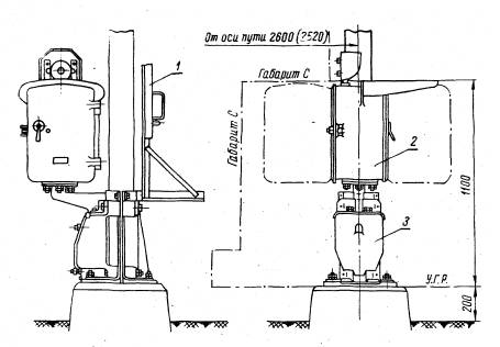 Все маневровые колонки имеют типовой чугунный корпус и панели одинаковых размеров. Комплект маневровых колонок типов МК-4, МK-6 и МКСП состоит из корпуса с козырьком, металлической трубной подставки, гудка и ключа, комплект колонок МККУ и МКДЦ, при установке на светофорных мачтах, - из корпуса с козырьком, кронштейна, звонка и ключа. Расстояние от наиболее выступающей части колонки до оси пути должна быть не менее: 2450 мм при установке в междупутье и 2750 мм - у крайнего пути на обочине. Маневровые колонки с металлической подставкой (рис. 1) устанавливаются на бетонные фундаменты. На светофорных мачтах - металлических (рис. 2) и железобетонных (рис. 3) колонки закрепляются при помощи специальных кронштейнов.