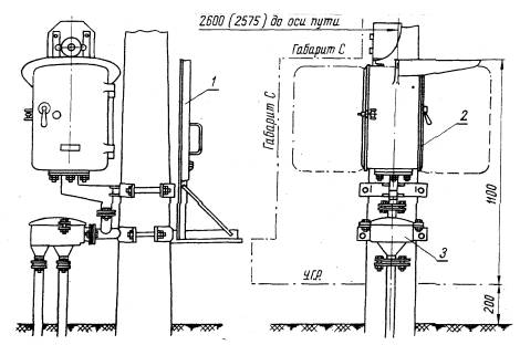 Рис. 2. Маневровая колонка местного управления на светофоре с металлической мачтой: 1 - лестница складная: 2 - маневровая колонка; 3 - стакан