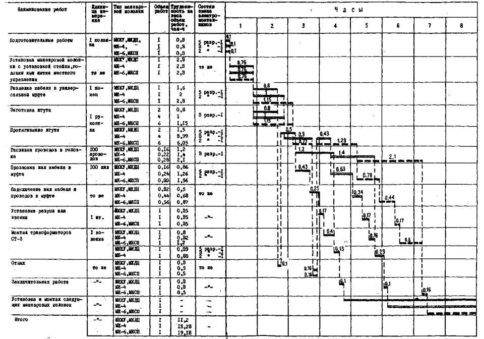 Примечание. Цифрами на графике показана продолжительность операций в часах V. Калькуляции затрат труда на установку и монтаж одной маневровой колонкиа) Типа МККУ, МКДЦ