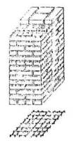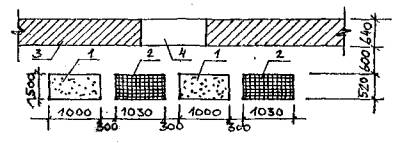 Рис. 6. Схема организации рабочего места каменщика: 1 - ящик с раствором емкостью 0,1 м3; 2 - поддон с кирпичем; 3 - возводимая стена; 4 - проем (размеры указаны в мм). Краткие рекомендации по технологии производства каменных работ1. Установка порядовок и натягивание причального шнура. Порядовки устанавливают к наружной поверхности стен таким образом, чтобы стороны, на которых намечены ряды кладки были обращены внутрь здания (в сторону каменщика). К порядовкам зачаливают причальный шнур. К деревянным порядовкам шнур крепят с помощью причальных скоб, а к металлическим - в просверленных отверстиях. 2. Подача и раскладка кирпича. Для доставки кирпича необходимо использовать поддоны с крюками. На поддонах кирпич укладывают в "елочку" с наклоном к центру пакета под углом 45°. При раскладке кирпича на возводимой стене кирпич размещают как можно ближе к месту укладки в следующем порядке: для лотковых рядов - параллельно стене или под небольшим утлом к ней, для тычковых - перпендикулярно оси стены. Для наружной версты кирпич раскладывают на внутренней половине стены, для внутренней - на наружной, при этом постель, предназначенная для укладки версты или забутки, не должна быть занята кирпичом. 3. Перелопачивание, расстилание и разравнивание раствора. Приготовление раствора производится на строительной площадке с помощью передвижного растворосмесителя. Готовый раствор перекладывают в бункер-тачку. Непосредственно перед подачей на стену раствор перелопачивают, так как за время, пока он лежит, происходит расслоение и он становится неоднородным. Для подачи и расстилания раствора на стене пользуются лопатой. Каменщик подает раствор на стену и расстилает его грядкой. Для ложкового верстового ряда раствор расстилают растворной лопатой в виде грядки шириной 80-100 мм, для тычкового - 200-220 мм. При кладке впустошовку, т.е. когда швы оставляют пустыми на глубину 10-15 мм от наружной поверхности стены, раствор расстилают с отступом от лица версты на 20-30 мм. При кладке с полным заполнением швов раствор расстилают с отступом от лицевой поверхности стены на 10-15 мм. Толщина грядки раствора, уложенного на стене, в среднем должна быть 20-25 мм. Окончательно растворную постель для укладки кирпича каменщик разравнивает кельмой. 4. Кладка стен с подбором, околкой и отеской кирпича. Рекомендуется вести кладку стен по многорядной системе перевязки. При этой системе продольные вертикальные швы через каждые пять лотковых рядов перекрываются тычковыми. Пятирядная кладка по системе многорядной перевязки показана на рис. 7.