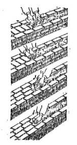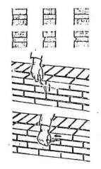 Рис. 9. Кладка забудки способом вприсык. 5. Расшивка швов Для уплотнения раствора в швах необходимо произвести расшивку швов. Расшивку швов производят на наружной поверхности стены. Формы швов показаны на рис. 10. Швы расшивают до схватывания раствора. Поверхность стены очищают от набрызгов щеткой, расшивают вертикальные швы, после чего - горизонтальные.