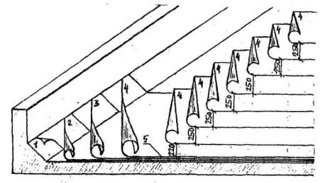 Рис. 15. Одновременная наклейка четырехслойного рулонного ковра со сдвижкой его полотнищ: 1 - полотнище шириной 250 мм; 2 - полотнище шириной 500 мм; 3 - полотнище шириной 750 мм; 4 - полномерное полотнище шириной 1000 мм; 5 - начальная кромка. Устройство кровли здания поста электрической централизации состоит из следующих этапов: 1. Устройство асфальтовой стяжки (20 мм) и уклонообразующего слоя по утеплителю. 2. Наклейки трехслойного рулонного ковра с нанесением растворителя удочкой-распылителем на мастичный слой с прикаткой (рис. 16). 3. Устройство бронирующего слоя толщиной 10 мм фракции 6 мм с подачей мастики на кровлю осуществляется механизировано с помощью установки СО-100А.