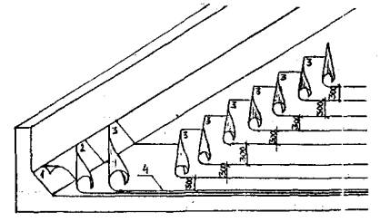 Рис. 16. Одновременная наклейка трехслойного рулонного ковра со сдвижкой его полотнищ: 1 - полотнище шириной 330 мм; 2 - полотнище шириной 670 мм; 3 - полномерное полотнище шириной 1000 мм; 4 - начальная кромка. Устройство кровли здания состоит из следующих этапов: 1. Устройство цементной стяжки толщиной 30 мм по утеплителю толщиной 100 мм. 2. Наклейка трехслойного рулонного ковра с нанесением растворителя удочкой-распылителем на мастичный слой с прикаткой. Устройство кровли багажно-хозяйственного блока состоит из следующих этапов: 1. Устройство цементной стяжки толщиной 20 мм. 2. Наклейка однослойного рулонного ковра с нанесением растворителя удочкой-распылителем на мастичный слой с прикаткой. Краткие рекомендации по технологии производства кровельных работРаботы по устройству кровли начинают с подготовки основания. Плиты покрытая очищают от пыли, грязи и мусора с помощью компрессора СО-76. Для удаления воды с основания кровли применяют машину CО-106, а для сушки кровли - машину CО-107. При устройстве пароизоляции из битумной мастики применяют машину для подогрева и нанесения битумной мастики на кроило CО-100A. Для устройства цементной стяжки устанавливают маячные рейки и заполняют пространство между рейками цементным раствором. Затем раствор разравнивают рейкой, передвигают по маячным рейкам и заглаживают полутерками отдельные места. После укладки одной полосы стяжки, маячные рейки устанавливают для выполнения следующей полосы цементной стяжки. Пазы после перестановки реек заделываются. При устройстве уклонообразующего слоя из керамзита устанавливают в шахматном порядке маяки, по которым набрасывают керамзит, разравнивают и уплотняют. Асфальтовую стяжку выполняют по маячным рейкам, расстояние между которыми 1,6-2,0 м. Пространство между рейками заполняется асфальтовой смесью, разравнивают гребками, уплотняют ручными катками. Температура асфальтовой смеси при укладке должна быть 160-180°C. В асфальтовой стяжке обязательно устраивают температурно-усадочные швы шириной 10 мм, затем их заливают битумной мастикой с асбестом. Наклейка рулонного ковра осуществляется при помощи установки для подплавления покровного слоя наплавляемого рубероида. Затем рулоны прикатывают машиной CО-108A. Сверху рубероидного покрытия устраивают защитный слой из гравия, втопленного в мастику. Гравий должен быть фракцией 3-10 мм и иметь окатанную форму без острых углов и граней. Перед началом работы гравий разогревают до температуры 150°С и разбрасывают его совковой лопатой по слою горячей мастики, которую разливают по кровле черпаком. Затем гравий прикатывают катком. Излишки гравия после остывания мастики сметают. Зерна гравия должны быть втоплены в мастику без просветов. Техника безопасности(Типовая инструкция по охране труда для кровельщика, М., ВПТИтрансстрой, 1984 г) К выполнению кровельных работ допускаются лица не моложе 18 лет, прошедшие медицинское освидетельствование, получившие знания по безопасности труда, сдавшие экзамены квалификационной комиссии в установленном порядке и получившие удостоверения на право производства работ. До получения удостоверения эти лица к самостоятельной работе не допускаются. При нарушении кровельщиком требований техники безопасности, а также при перерывах в работе более чем на 30 календарных дней и при каждом изменении 