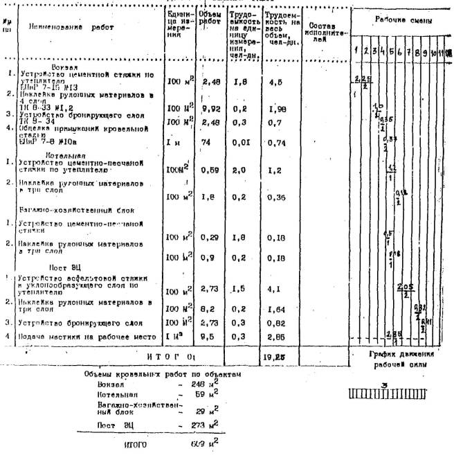 Состав бригады подобран при составлении графика производства работ в соответствии с едиными нормами и расценками, утвержденными Госстроем СССР, и типовыми технологическими нормами, разработанными ВПТИтрансстроем Минтраностроя. При организации процесса производства кровельных работ необходимо вести работы в соответствии со схемой, указанной на рис. 14.