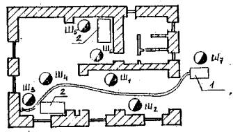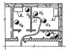 Рис. 23. Организация рабочих мест бригады штукатуров при производстве улучшенной штукатурки механизированным способом: Ш1 - штукатур III-го разр. и Ш2 - штукатур II разр - подготовка поверхности стен под оштукатуривание; Ш3 - штукатур IV разр. и Ш4 - штукатур III разр. - механизированное нанесение обрызга и грунта: Ш5 - штукатур IV разр. и Ш6 - штукатур III-го разр. - нанесение накрывочного слоя и затирка его; 1 - форсунка штукатурно-смесительного агрегата СО-57Б; 2 - универсальные подмости ЦНИИОМТП; рабочее место машиниста штукатурно-смесительного агрегата на схеме не показано