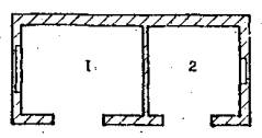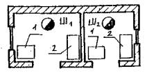 Рис. 25. Организация рабочих мест штукатуров при производстве простой штукатурки: Ш1 - штукатур IV разр. и Ш2 - штукатур III разр. - нанесение обрызга и грунта с разравниванием, затирка поверхности; 1 - тележка с раствором; 2 - универсальные подмости ЦНИИОМТП Схема движения штукатуров при оштукатуривании стен, внутренних помещении вокзала, поста ЭЦ, котельной и багажно-хозяйственного блока показана на рис. 26-30.