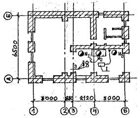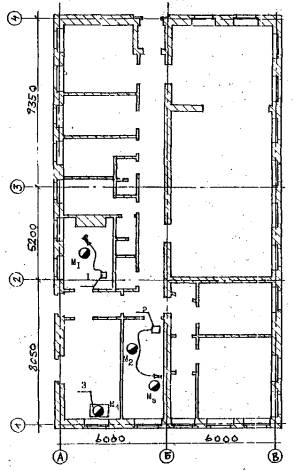Рис. 40. Организация рабочих мест маляров в здании котельной: 1 - электрокраскопульт; 2 - универсальные подмости; 3 - емкости с малярными составами; М1, М2, и М3 - рабочие мести маляров.