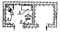Рис. 30. Организация рабочих мест штукатуров в здании поста электрической централизации: 1 - штукатурно-смесительный агрегат СО-57Б; 2 - универсальные подмости ЦНИИОМТП;