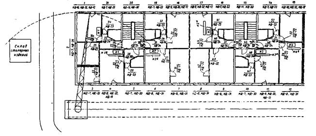 Схема организации работ. Захватка 1. III. УКАЗАНИЯ ПО ОРГАНИЗАЦИИ ТРУДАУстановку оконных, балконных, дверных блоков, подоконных досок и устройство тамбуров выполняет звено в составе двух плотников 4 и 3 разр. в первую смену. Плотник 3 разр. нарезает на строительной площадке толь на полосы необходимого размера, плотник 4 разр. прибивает его по всему периметру блоков гвоздями по планкам, затем оба плотника укладывают изделия в пакеты по 4-8 шт. согласно прилагаемой ведомости (см. таблицу) и увязывают тросом. Каждый пакет комплектуется блоками и подоконниками на одну квартиру. Ведомость комплектации блоков(на типовой этаж)