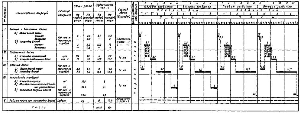 Блоки и подоконные доски поднимают на этажи краном. В первую очередь устанавливают оконные и балконные блоки, подоконные доски. Плотник 3 разр. расчищает места для установки блоков и расстроповывает их, крепит шурупами металлические кронштейны к пробкам (для установки подоконных досок), временно раскрепляет деревянными клиньями блоки и забивает ерши в пробки панелей. Плотник 4 разр. проверяет размеры проема, размечает места установки кронштейнов, блоков и подоконных досок, вместе с плотником 3 разр. устанавливает их в проектное положение, выверяет правильность установки при помощи уровня, отвеса и метра, крепит блоки шурупами к ершам, а подоконные доски - к кронштейнам. После установки оконных и балконных блоков, подоконных досок устанавливают дверные блоки, а потом переходят на следующую захватку. При установке дверных блоков плотник 3 разр. расчищает места для установки блоков и крепит блоки гвоздями к перегородке или ершами к бетонным панелям стен, плотник 4 разр. размечает места установки блоков, вместе с плотником 3 разр. устанавливает блоки в проектное положение, проверяет правильность установки по уровню и отвесу. По окончании установки блоков на этаже приступают к устройству тамбуров. Плотник 3 разр. расчищает места под тамбуры, вместе с плотником 4 разр. устанавливает каркас из готовых брусьев, крепит его к стене ершами, устанавливает инвентарные подмости для подшивки потолков, вместе с плотником 4 разр. подшивает потолки и обивает стены плитным утеплителем. Плотник 4 разр. проверяет правильность установки каркаса по уровню и отвесу, вместе с плотником 3 разр. выполняет подшивку потолков и обшивку стен, а затем оба плотника устанавливают дверные блоки в такой же последовательности, что и дверные блоки в квартирах. Строповку материалов, пакетов с дверными блоками и подоконными досками на стройплощадке выполняет это же звено плотников во время комплектации изделий. Строповку оконных блоков выполняет такелажник. Затраты труда такелажника, ввиду малого объема, учитываются вместе со звеном плотников. IV. ГРАФИК ПРОИЗВОДСТВА РАБОТ (на этаж)