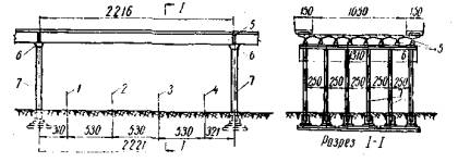 I. ОБЛАСТЬ ПРИМЕНЕНИЯТехнологическая карта разработана на основе применения методов научной организации труда и предназначена для использования при разработке проекта производства работ и организации труда на объекте. Устанавливаемое пролетное строение - сборное железобетонное (типовой проект инв. № 172/2 Союздорпроекта, 1963 г.) - состоит из 8 балок. Длина балки - 22,16 м, объем бетона - 10,55 м3, вес - 26,4 т, ширина балки по верху-1,62 м, высота-1,2 м. Расстояние между перилами пролетного строения-13,5 м, в том числе проезжая часть - 10,5 м и два тротуара по 1,5 м (габарит Г-10,5). Сxемa монтируемого пролетного строения показана на рис. 1.