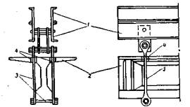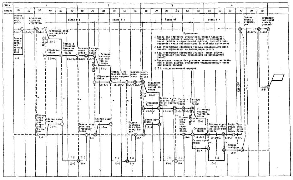 Рис. 3. Деталь строповки балки к траверсе: 1 - траверса; 2 - балка; 3 - строповочное приспособление; 4 - отверстия в плите балки Застропленную балку поднимают на необходимую высоту и поворотом стрелы крана устанавливают в пролет на опорные части. Первую балку устанавливают при наибольшем вылете стрелы - 11,98 м, последующие - соответственно при вылетах, равных 10,32, 8,66 и 7 м. Временно балки на опоре раскрепляют деревянными подкосами. После снятия последней четвертой балки тепловоз перемещает состав из платформ на запасные пути и возвращается за краном. По окончании работ и освобождении путей место работ тщательно убирают и снимают сигналы ограждения. Установка четырех балок продолжается 4 ч. Для монтажа пролетного строения из восьми балок необходимо два «окна», каждое продолжительностью 4 ч. При установке балок пролетных строений путепровода следует руководствоваться следующими техническими документами: - СНиП III-Д.2-62 «Мосты и трубы». Правила организации и производства работ. Приемка в эксплуатацию. СНиП III-A.11-62 «Техника безопасности в строительстве». «Правила техники безопасности и производственной санитарии при сооружении мостов и труб», Оргтрансстрой, 1969 г. «Правила технической эксплуатации железных дорог СССР». «Инструкция по сигнализации на железных дорогах СССР». Для обеспечения выполнения работ в «окно» продолжительностью 4 ч в технологической карте принята бригада монтажников конструкций в количестве 12 чел., в том числе: 6 разр. - 1; 5 разр. - 1; 4 разр. - 3; 3 разр. - 3; 2 разр. - 4. Кран обслуживают машинисты 6 разр.-1 и 5 разр.-1. Сигналисты для ограждения места работ при закрытии движения поездов выставляются в соответствии с инструкцией по сигнализации, оплачиваются повременно и в состав бригады не включены. Наиболее трудоемкой работой является установка и снятие крана с аутригеров. Ее выполняют под руководством машинистов крана всем составом бригады. На остальных операциях работа выполняется отдельными звеньями и параллельно, что сокращает время выполнения работ. Четыре человека (4 разр. - 1; 3 разр. - 1 и 2 разр. - 2) сопровождают состав с балками под строповку. Стропует звено в количестве 6 чел. (6 разр. - 1; 4 разр. - 2; 3 разр. - 2 и 2разр. - 1). С каждого конца балки работают по 3 чел. Четыре человека (4 разр. - 1; 3 разр. - 1; 2 разр. - 2) снимают крепления балки к платформам, два (5 разр. - 1; 2 разр. - 1) - устанавливают на опоре резиновые опорные части. Подъем и установку балки выполняет звено из 10 монтажников. Бригадир следит за работой и подает команды машинисту крана, 4 чел. (4 разр. - 2 и 2 разр. - 2) остаются на оттяжках, а 5 чел. (5 разр. - 1; 4 разр. - 1; 3 разр. - 3) поднимаются на опоры для приема и установки балки. В это время у двух монтажников 2 разр. технологический перерыв. Временное раскрепление и расстроповку балки выполняет то же звено, что и установку, за исключением 2 чел. (4 разр. - 1; 3 разр. - 1), которые присоединяются к рабочим, имеющим технологический перерыв, и затем вместе с ними переходят на подачу очередной балки под строповку. Два человека с башмаками сопровождают состав с платформами и подкладывают их под колеса при остановке, а два следят за точной установкой платформ. IV. ГРАФИК ВЫПОЛНЕНИЯ ПРОИЗВОДСТВЕННОГО ПРОЦЕССАВсе работы по установке пролетных строений выполняются при отсутствии движения поездов (в «окно») по сетевому графику. Сетевой график составлен в кале
