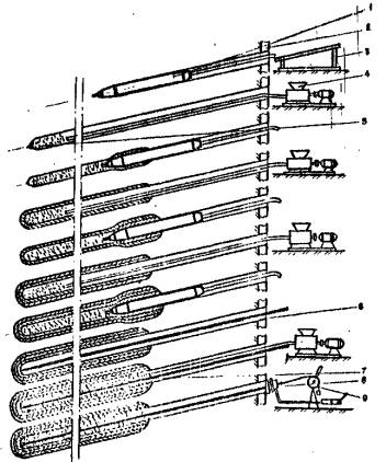 2.4. Пробивка пневмопробойником лидирующей скважины выполняется в следующем порядке: 2.4.1. Установка стартовой площадки, опорные стойки которой должны быть совмещены с направляющей. Ориентирование стартовой площадки по уровню и закрепление её. 2.4.2. Установка пневмопробойника на стартовую площадку, подключение его с помощью шлангов к компрессору. 2.4.3. Запуск пневмопробойника. Для облегчения внедрения пневмопробойника в грунт запуск следует производить на пониженном (3...4 кг/см2) давлении. Запуск пневмопробойника осуществляется резким открытием пробкового крана. 2.4.4. После внедрения пневмопробойника примерно на 1/2…1/3 длины корпуса в грунт (т.е. до надежного зацепления), необходимо машину остановить, скорректировать направление её движения, смещая хвостовую часть рычагом в нужную сторону. Вновь запустить пневмопробойник и довести давление до 6 кг/см2. 2.4.5. При проходке скважины длину её определяют по меткам на шланге подачи воздуха к пневмопробойнику. Разметку шланга следует производить, заглушив его свободный конец, под давлением воздуха 6 кгс/см2. 2.4.6. По постижении расчетной длины скважины пневмопробойник необходимо пустить в обратном направлении (среверсировать). Реверсирование выполняют в такой последовательности: прекращают подачу воздуха; разъединяют ближайшее к устью скважины соединение шлангов; присоединенный к пневмопробойнику конец шланга раскладывают по прямой вдоль оси скважины; вращением шланга против часовой стрелки патрубок золотника выворачивают в крайнее заднее положение (для чего необходимо сделать 12...14 оборотов). При вращении шлангу, находящемуся в скважине, сообщают натяжение; соединяют разъем шланга и резко открывают пробковый кран. При выходе машины из грунта во избежание обрушения устья скважины нужно снизить давление воздуха до 3...4 кгс/см2. 2.4.7. После выхода пневмопробойника из скважины прекращают подачу сжатого воздуха, шланг разъединяют, заглушают его концы и устанавливают патрубок в положение прямого хода. 2.5. Формирование замка анкера производят в следующем порядке: 2.5.1. К растворонагнетателю PH-I присоединяют шланг для подачи сжатого воздуха от компрессора (технические характеристики растворонагнетателя PH-I приведены в табл. 2.2); 2.5.2. К выходному отверстию PH-I присоединяют рукав внутренним диаметром 50 мм. Рукав для подачи цементно-песчаной смеси, если жесткость его оказывается недостаточной, может быть усилен стержнем диаметром 10...12 мм. Выполняют это следующим образом. Рукав раскладывают на ровной поверхности, рядом укладывают арматурный стержень. Один из концов стержня должен совпадать со свободным концом рукава. На рукав, у свободного конца, в два слоя, наматывают изоляционную ленту на тканевой основе, ширина намотки 10 см. Такую намотку повторяют еще четыре раза с шагом 0,5 м. К рукаву прижимают арматурный стержень и вновь проводят намотку изоленты с захватом стержня, ширина намотки та же - 10 см, число слоев от 4 до 5. На расстоянии, равном длине скважины, стержень изгибают под углом 90° и далее, через один метр, еще на 90°, так, чтобы он вновь был параллелен оси скважины и свободный конец направлен в сторону PH-I. Основные технические характеристики растворонагнетателя PH-I