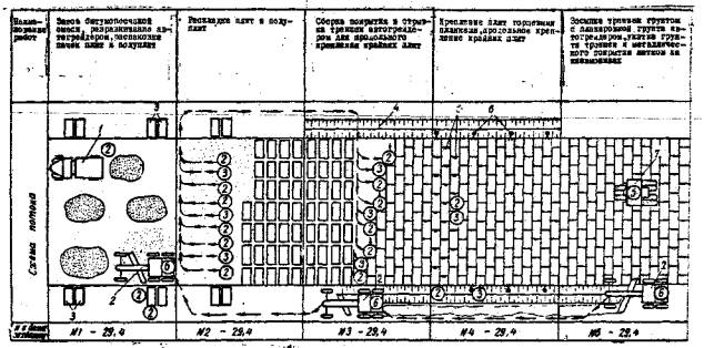 Вес одной плиты - 41 кг, пачки плит - 830 кг, пачки полуплит - 415 кг, торцевой планки - 0,11 кг, 1 м2 покрытия - 32,5 кг, полного комплекта плит - 6600 т. Плиты и полуплиты окрашены в зеленый цвет, а торцевые планки - в желтый цвет для обнаружения их на поверхности металлического покрытия. Для лучшего опознания ВПП с воздуха кромки ВПП полуплитм рекомендуется окрашивать в яркий цвет. Во всех случаях применения настоящей технологической карты необходима привязка ее к местным условиям производства работ. II. Указания по технологии производственного процессаДо устройства выравнивающего слоя из битумопесчаной смеси в пределах захватки должны быть полностью закончены и приняты технической инспекцией все работы, связанные с отделкой и уплотнением земляного полотна, грунтоцементного основания и устройства водоотвода. Последовательность выполнения работ по устройству выравнивающего слоя из битумопесчаной смеси и сборного покрытия на металлических плит с расстановкой машин и оборудования отражает технологическая схема (рис. 1). Устройство выравнивающего слоя из битумопесчаной смеси и отрывка траншеи для крепления кромок покрытия Битумопесчаную смесь завозят на место работ на всю ширину ВПП автомобилями-самосвалами, передвигающимися по готовому цементо-грунтовому основанию. Для обеспечения равномерной отсыпки смеси на основании кучками песка намечают места разгрузки каждого автомобиля-самосвала, так, чтобы 1 м3 битумогрунтовой смеси приходился на 15-20 м2 покрытия. Завезенную битумогрунтовую смесь разравнивают автогрейдером, контролируя толщину слоя щупом. Толщину разравниваемой битумопесчаной смеси устанавливают на месте работ с учетом коэффициента уплотнения. Перед разравниванием смеси автогрейдером отрывают по краям и торцам ВПП траншею треугольного сечения следующих размеров (в см): а) для крепления продольных (боковых) кромок ширина - 100-120; глубина - 50-60 б) для крепления торцевых кромок ширина - 160; глубина - 80.