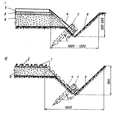 Рис. 2. Крепление кромок металлического покрытия: а) продольных; б) торцевых; 1 - металлическая плита К-1Д; 2 - выравнивающий слой из битумопесчаной смеси; 3 - основание; 4 - проволочная скрутка; 5 - деревянный кол длиной 50-60 см и диаметром 8-10 см; 6 - траншея треугольного сечения IV. График устройства сборных