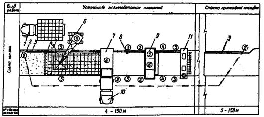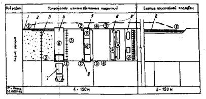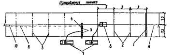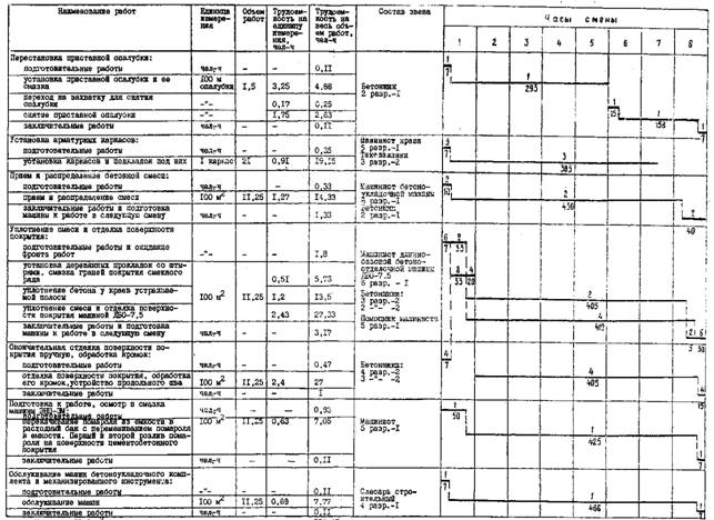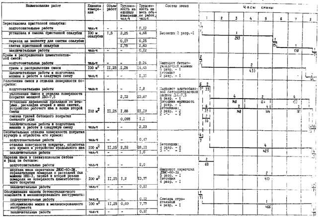 МИНИСТЕРСТВО ТРАНСПОРТНОГО СТРОИТЕЛЬСТВА ВСЕСОЮЗНЫЙ ПРОЕКТНО-ТЕХНОЛОГИЧЕСКИЙ ИНСТИТУТ ТРАНСПОРТНОГО СТРОИТЕЛЬСТВА «ВПТИТРАНССТРОЙ» ТЕХНОЛОГИЧЕСКИЕ КАРТЫУСТРОЙСТВО ЦЕМЕНТОБЕТОННЫХ И ЖЕЛЕЗОБЕТОННЫХ АЭРОДРОМНЫХ ПОКРЫТИЙ МОСКВА 1984 Технологические карты разработаны отделом проектирования и внедрения технологии строительства автомобильных дорог и аэродромов и предназначены для применения при разработке проектов производства работ, а также для организации труда на объектах строительства (исполнители В.К. Пишванов, Л.С. Королева, Л.А. Мелешкина). Издание третье, переработанное, дополненное (исполнители С.Л. Маляровская, Е.Ю. Яркина). Главный инженер института В.И. ШТЕЙН Зам. зав. отделом автодорог и аэродромов Т.П. БАГИРОВА Исполнители: С.Л. МАЛЯРОВСКАЯ, Е.Ю. ЯРКИНА СОДЕРЖАНИЕ ВВЕДЕНИЕТехнологические карты разработаны взамен технологических карт «Устройство цементобетонных и железобетонных аэродромных покрытий», Оргтрансстрой, М., 1976 с учетом изменений и дополнений в связи с выходом новых СНиПов, ВСН, а также накопленного опыта строительства и выпуска новых машин и механизмов. Сборник состоит из шести технологических карт, охватывающих весь комплекс работ по устройству цементобетонных и железобетонных покрытий: Карта № 1. «Устройство битумно-песчаного выравнивающего слоя». Карта № 2. «Установка и снятие рельс-форм». Карта № 3. «Устройство цементобетонных аэродромных покрытий». Карта № 4. «Устройство железобетонных аэродромных покрытий». Карта № 5. «Нарезка швов в затвердевшем бетоне нарезчиками ДС-112 и ДС-115». Карта № 6. «Заполнение швов битумными мастиками с применением заливщика ДС-67». В настоящих технологических картах предусмотрены: сменная производительность на устройстве цементобетонного и железобетонного покрытия - 150 м (работы выполняются на 7 захватках); уплотнение и отделка поверхности бетонного покрытия длиннобазовой бетоноотделочной машиной ДБО-7,5; уход за бетоном нанесением пленкообразующих материалов; нарезка контрольных швов в свежеуложенном бетоне через 21 м нарезчиком ДНШС-60-3М, с последующей нарезкой остальных швов нарезчиками ДС-112 и ДС-115 с алмазными дисками; устройство швов расширения через 56 м; заполнение пазов швов битумными мастиками с использованием заливщика ДС-67. Однослойное цементобетонное и железобетонное покрытие имеет толщину 24 см при ширине бетонируемого ряда 7,5 м и укладывается по битумно-выравнивающему слою толщиной 5 см на цементо-грунтовое основание. Последовательность бетонирования рядов определяют в зависимости от профиля покрытия взлетно-посадочных полос, рулежных дорожек и мест стоянок. При односкатном профиле ряды бетонируют, начиная от обочины с высшей отметкой, при двускатном профиле - от гребня. При производстве работ по устройству цементобетонных и железобетонных покрытий следует руководствоваться следующей нормативно-технической литературой: СНиП III-46-79 «Правила производства и приемки работ. Аэродромы» М., Стройиздат, 1981. «Инструкцией по строительству цементобетонных покрытий автомобильных дорог» ВСН 139-80, М., 1980. При выполнении работ рабочие должны строго соблюдать правила и указания по ч технике безопасности, изложенные в СНиП III-4-80 «Техника безопасности в строительстве», М., Стройиздат, 1980 и «Правилах техники безопасности при строительстве, ремонте и содержа