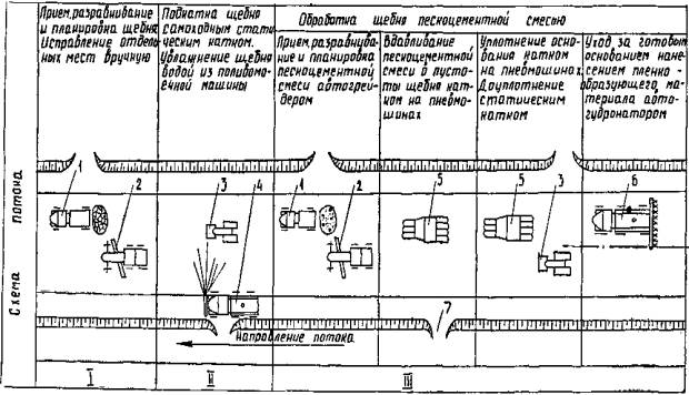 ВВЕДЕНИЕТехнологические карты разработаны на основе применения принципов научной организации труда и предназначены для использования при составлении проектов производства работ и при организации труда на объекте. Сборник состоит из трех технологических карт: № 1. «Устройство щебеночного основания, обработанного в верхней части пескоцементной смесью по способу пропитки с использованием для уплотнения катков на пневмошинах». № 2. «Устройство щебеночного основания, обработанного в верхней части пескоцементной смесью по способу пропитки с использованием для уплотнения виброкатков». № 3. «Устройство щебеночного основания, обработанного в верхней части пескоцементной смесью по способу пропитки с использованием для уплотнения кулачковых катков». В технологических картах предусмотрен темп устройства основания шириной 9 м 230 м в смену. В технологических картах № 1 и 2 толщина основания в плотном теле принята 18 см, в том числе глубина обработки (пропитки) пескоцементной смесью - 8 см и толщина поверхностного слоя из чистого пескоцемента - не более 2 см. В технологической карте № 3 толщина основания в плотном теле принята 20 см, в том числе глубина обработки (пропитки) пескоцементной смесью - 14 см. Пескоцементную смесь готовят в смесительной установке типа ДС-50А, доставляют к месту укладки автомобилями-самосвалами средней грузоподъемности и распределяют тонким слоем (в картах № 1 и 2 толщина слоя принята 5 см, в карте № 3 - 6,5 см) поверх уложенного и прикатанного щебеночного слоя. Пескоцементную смесь вдавливают в пустоты щебня при помощи пневмокатков, виброкатков или кулачковых катков и уплотняют катками. При производстве работ следует соблюдать
