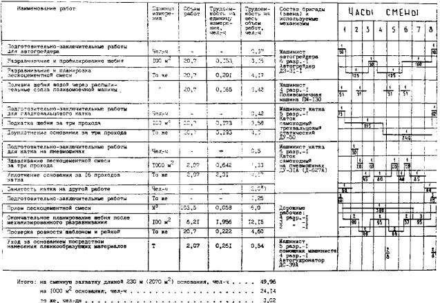 Примечание. *Трудоемкость не включена в итог на смертную захватку; полуприцепной каток на пневмошинах ДУ-16В занят на других работах: уплотнении верха земляного полотна, досыпке обочин или валиков для упора основания.